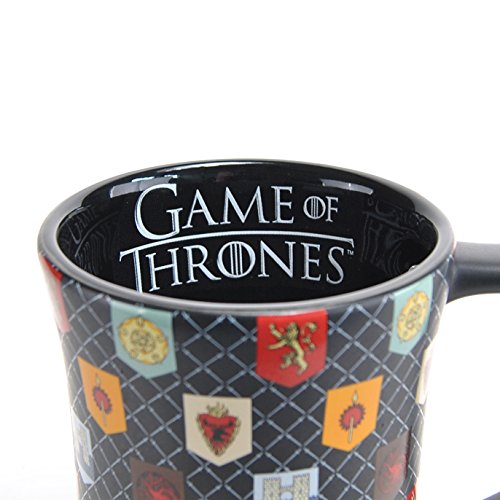 Diese erstklassige Tasse hat eine leichte Einwärtskrümmung und einen quadratischen Griff. Es verfügt über eine mattschwarze Glasur mit verschiedenen Haus-Sigillen in punktuellen UV-Details – Stark, Lannister, Targaryen, Baratheon von Dragonstone, Bolton, Tyrell, Martell, Frey, Tully und Arryn. Hinter den Sigillen ist ein wiederholtes Schwertdesign. Das Innere des Bechers hat eine glänzende, schwarze Glasur und das Game of Thrones Logo in Weiß auf der Felge. Dieses auffallende und sammelbare Stück ist ein wunderbares Geschenk für jeden Fan von Game of Thrones.