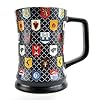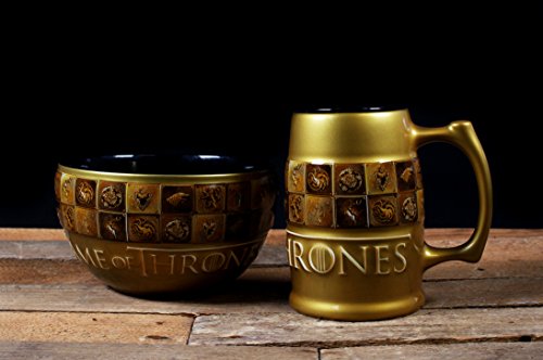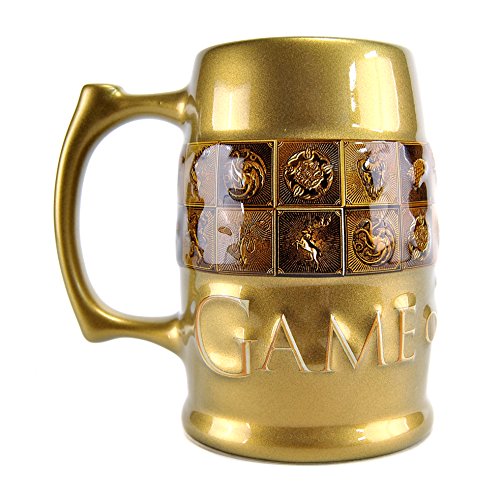 Dieser erstklassige Becher von Game of Thrones besteht aus einer auffälligen Gold-Galaxie-Glasur auf der Außenseite, die an die Gold-Dragon-Münzen von Westeros erinnert, und einer schwarzen glänzenden Glasur auf der Innenseite. Das Game of Thrones Logo ist auf der Vorderseite des Kruges in Creme und Gold geprägt, während der mittlere Teil des Kruges ein geprägtes Design hat, das sich vollständig umhüllt. In diesem Entwurf sind die Siegel der bekanntesten Häuser der Geschichte – Stark, Lannister, Targaryen, Baratheon von Dragonstone, Baratheon von Storm’s End, Greyjoy und Tyrell – in einer goldenen und bronzenen Fahne dargestellt.